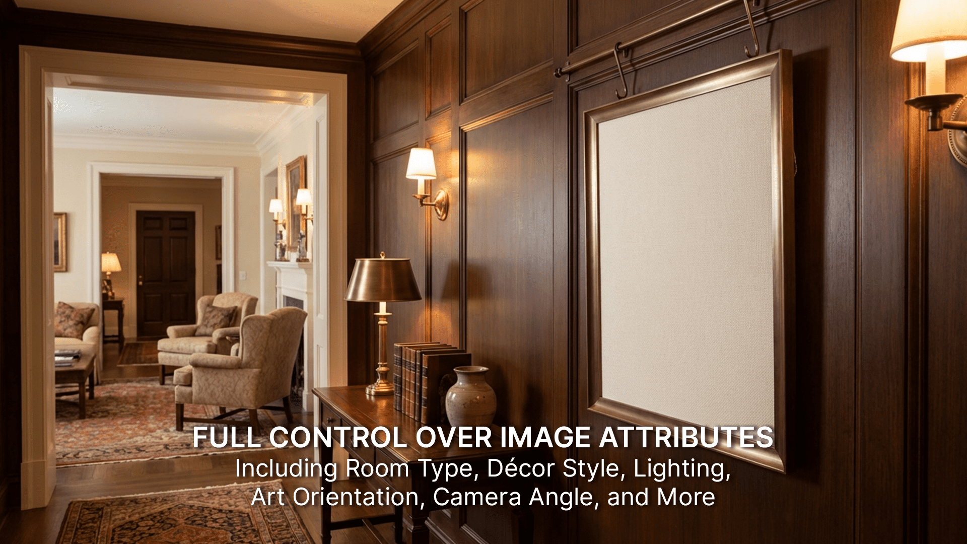 With MetaMock, you control how your wall art appears using 9 attributes and over 50 options including room type, decor style, lighting, art orientation, camera angle and so much more.