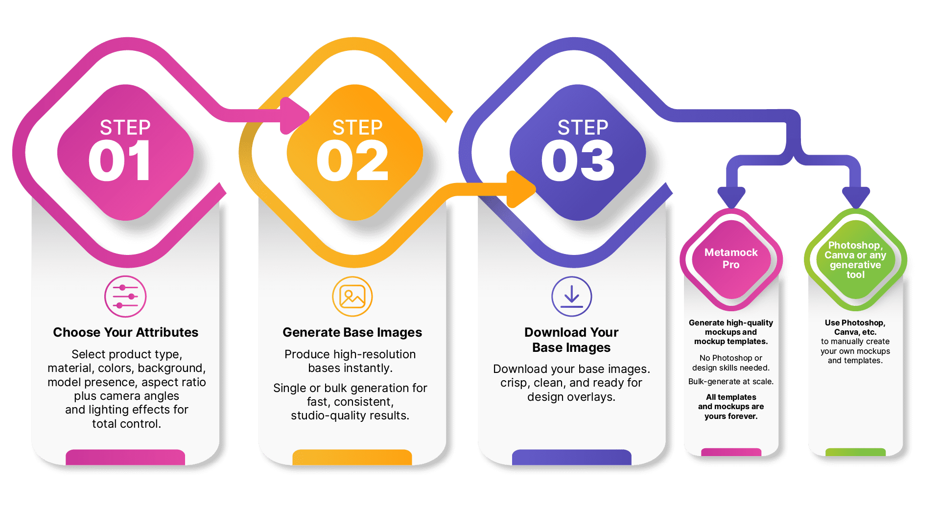 Metamock generates product-accurate base images so your mockups look real. Use these images to generate mockup templates in Canva, Photoshop, Pixlr or any tool of your choice.